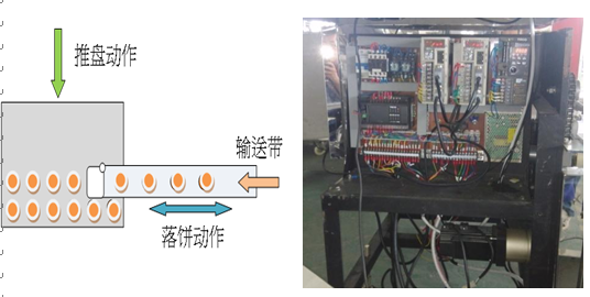 3.落餅循環(huán):整盤落餅完成后,X、Y軸回原點,落盤電機動作,落下新盤,并由Y軸推出,落餅循環(huán)。