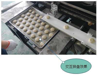 2.推盤動作:落餅完成一行后,X軸回原點,Y軸伺服推動托盤一定距離(根據(jù)工藝設(shè)定),第二行落餅開始。