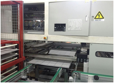 排版機(jī)把串焊機(jī)輸送過來的電池串(有正負(fù)極之分)按照設(shè)定好的正負(fù)順序進(jìn)行取片、校正,然后放到按照設(shè)定的距離排到EVA覆膜后的玻璃上。